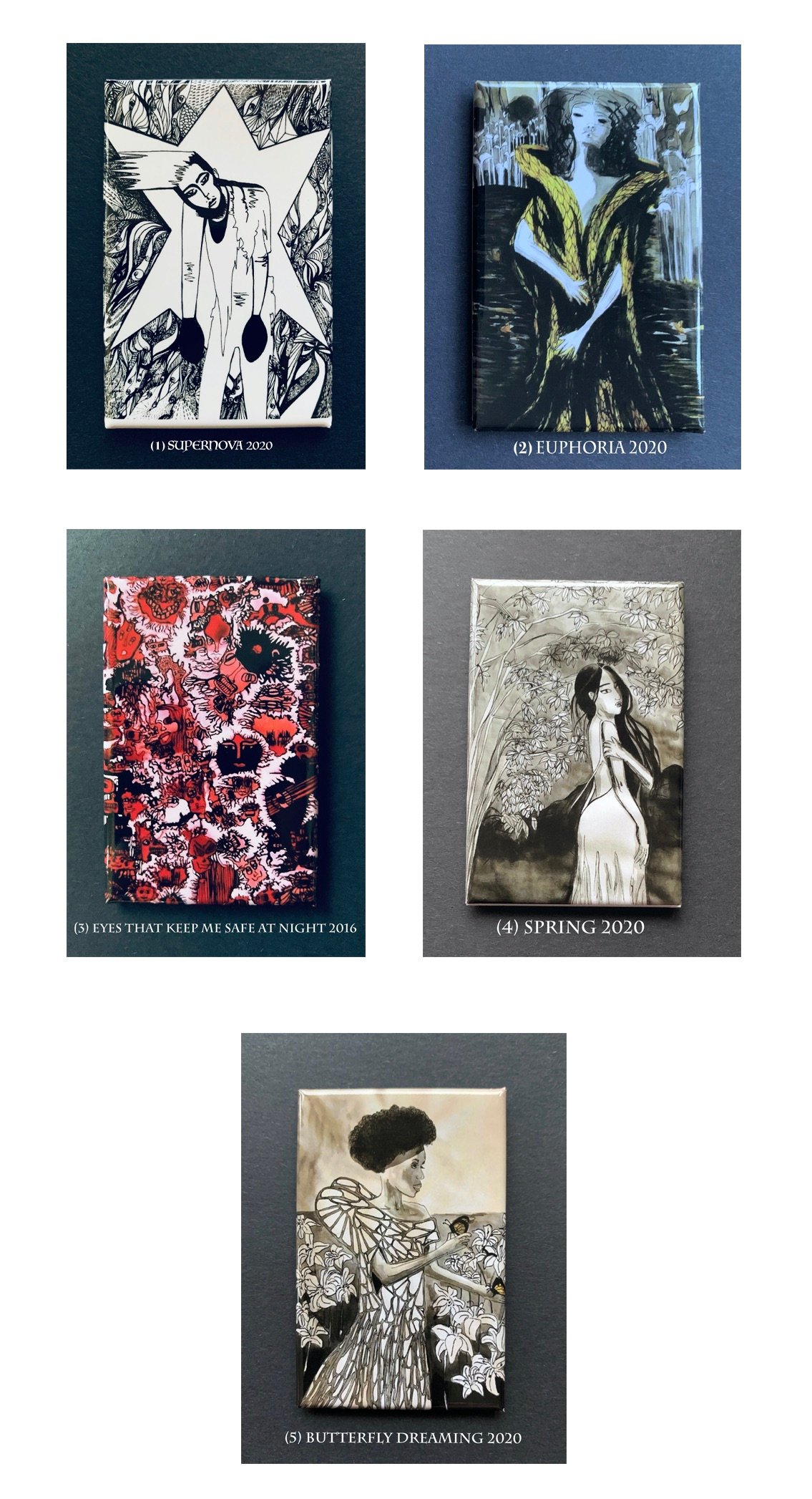 5 artworks available - Images are titled and numbered.